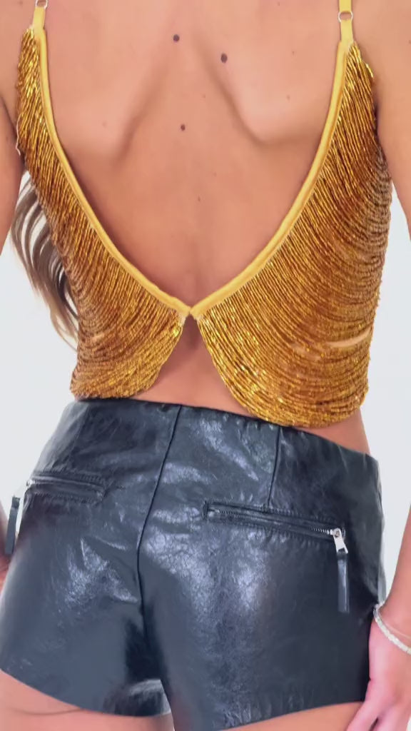 The crop-style silhouette adds a contemporary edge, while the back clasp closure ensures a secure and elegant fit. Each piece showcases exceptional craftsmanship, making it not just a top, but a showstopper.