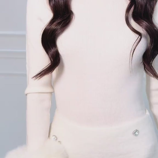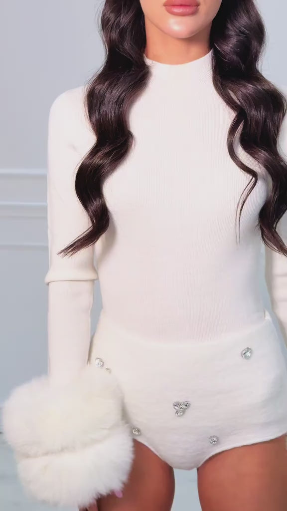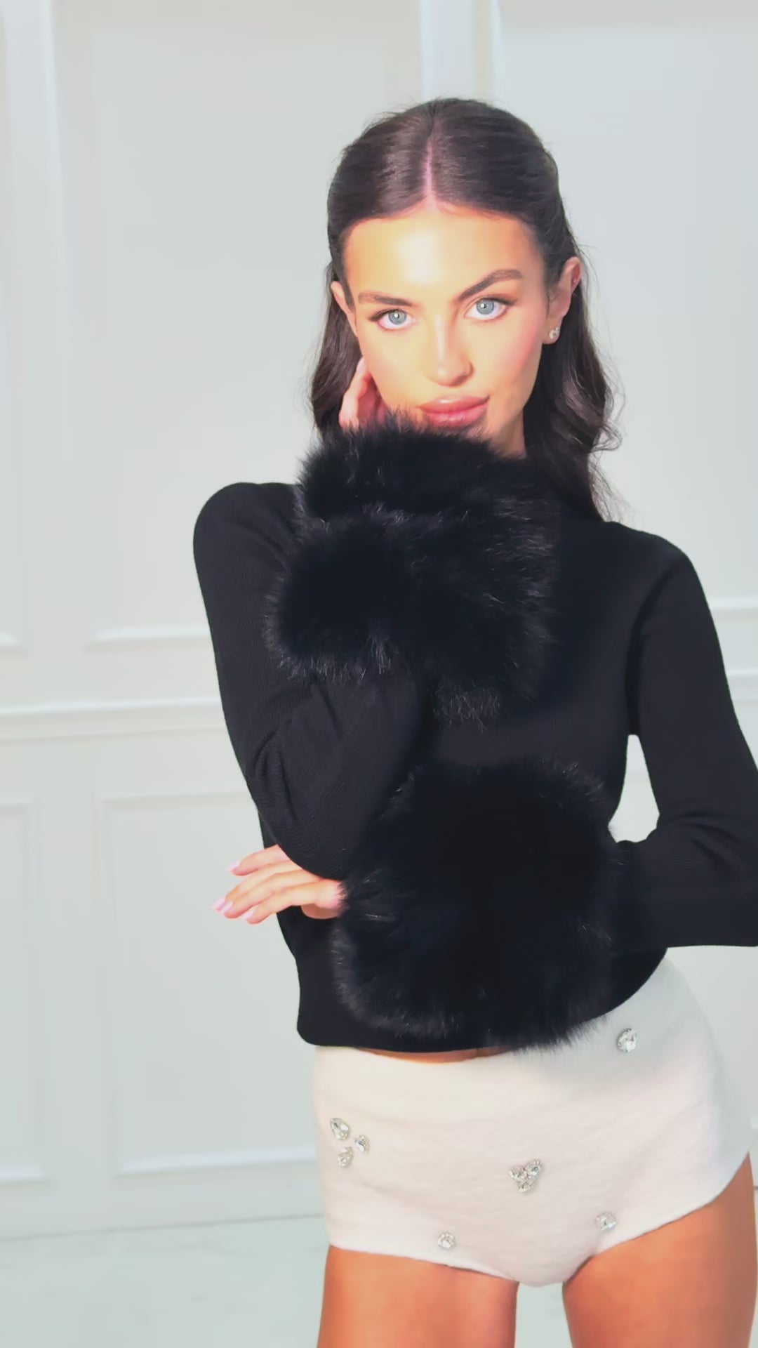 Elevate your wardrobe with these luxurious wool micro shorts, adorned with hand-sewn diamantés for an elegant, eye-catching finish. Designed to be effortlessly versatile, they can be styled up for a night out or dressed down for a chic daytime look. Perfectly paired with our Loren fox-fur sweater, these shorts complete a standout ensemble. Fits true to size for a flattering, comfortable wear.