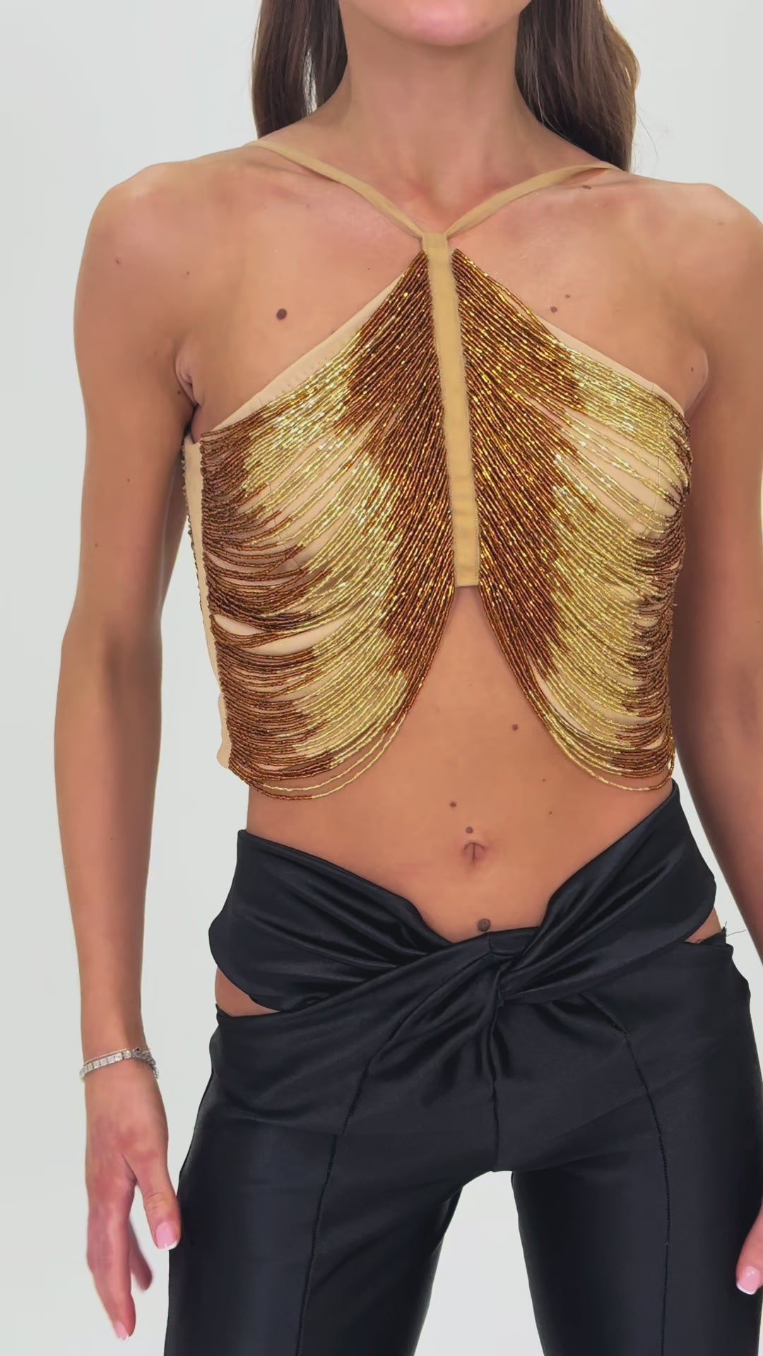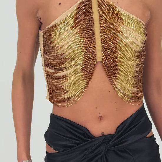 The crop-style silhouette adds a contemporary edge, while the back clasp closure ensures a secure and elegant fit. Each piece showcases exceptional craftsmanship, making it not just a top, but a showstopper.