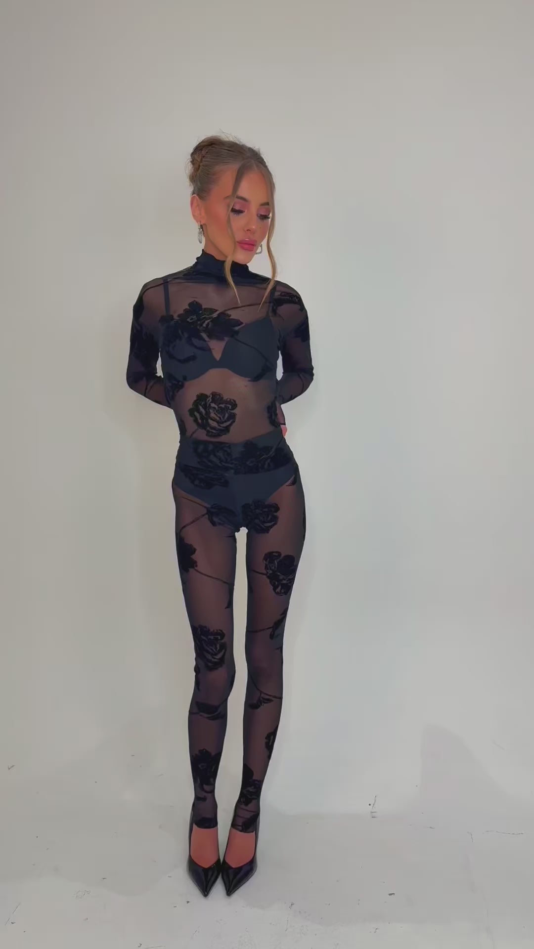Crafted from stretch mesh fabric, this two-piece set features an all-over velvet rose design for a statement finish. True to size.