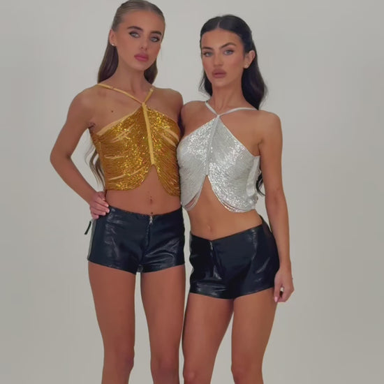 The crop-style silhouette adds a contemporary edge, while the back clasp closure ensures a secure and elegant fit. Each piece showcases exceptional craftsmanship, making it not just a top, but a showstopper.